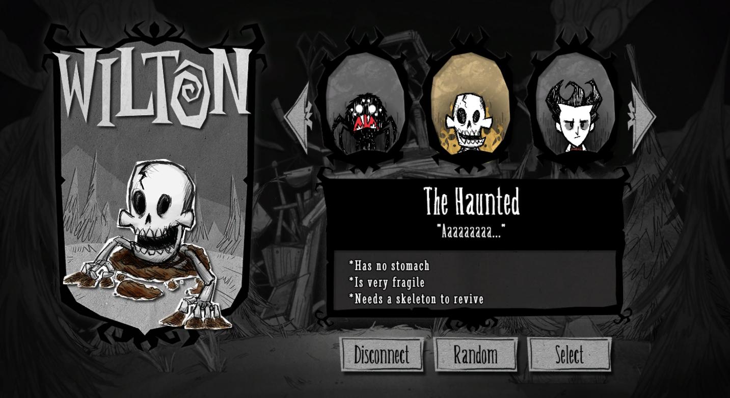 Wilton is brittle, spooky, fast, hits weak, doesn't starve, has little sanity his rotting brain left him with, carries a Bone-A-Rang and will reincarnate from other skeletons in the world. Hope to see this mod improved, keep it going.